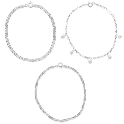 Cheap Sterling Silver Set of Three: Bismarck, Figaro w/ Freshwater Pearl Drops and 040-Gauge Singapore Chain Bracelets, 7" Review