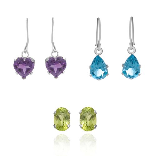 Enhance your jewelry collection with three pairs of individually-boxed gemstone earrings, all crafted in 10 karat white gold. Included in the set are golden-green peridot, blue topaz, and purple amethyst, in oval, pear, and heart shapes respectively. The stones are all mounted in secure four-prong settings. The peridot gemstones are featured on posts with friction backings, while the topaz and amethyst gemstones dangle freely from shepherd's hooks.