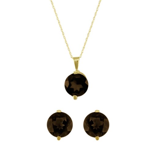 The warm, radiant brown tones of this smoky quartz earring and pendant set will complement a wide range of outfits. Both the stud earrings and the solitaire pendant feature small faceted rounds of smoky quartz, prong set in 10 karat yellow gold. The rich tones of the yellow gold setting complement the stones beautifully. The earrings are featured on posts with friction backs, and the pendant is showcased on an 18-inch light rope chain.