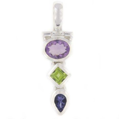 This gorgeous hand- crafted pendant incorporates beautifully finished sterling silver and three faceted natural stones. This amethyst, peridot and iolite pendant measures 1.75" x .4". An Element Jewelry gift box is included with this purchase..