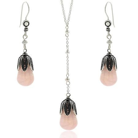 Cheap Sterling Silver .925 Genuine Rose Quartz Stone Leaf Petal Bead Dangle Hook Earrings & Y Necklace 18.5-19.5 Jewelry Set Review