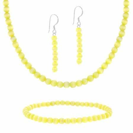 Cheap Sterling Silver Yellow Simulated Cats Eye Stone Bead Beaded Dangle Hook Earrings Stretch Bracelet Necklace 15-19" Jewelry Set Review