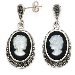 Step back in time with these beautiful cameo earrings. Genuine Mother of Pearl shimmers atop the black onyx with is then surrounded by cut marcasite stones. They are mounted on notched posts for a secure fit. An Element Jewelry gift box is also included with this purchase..